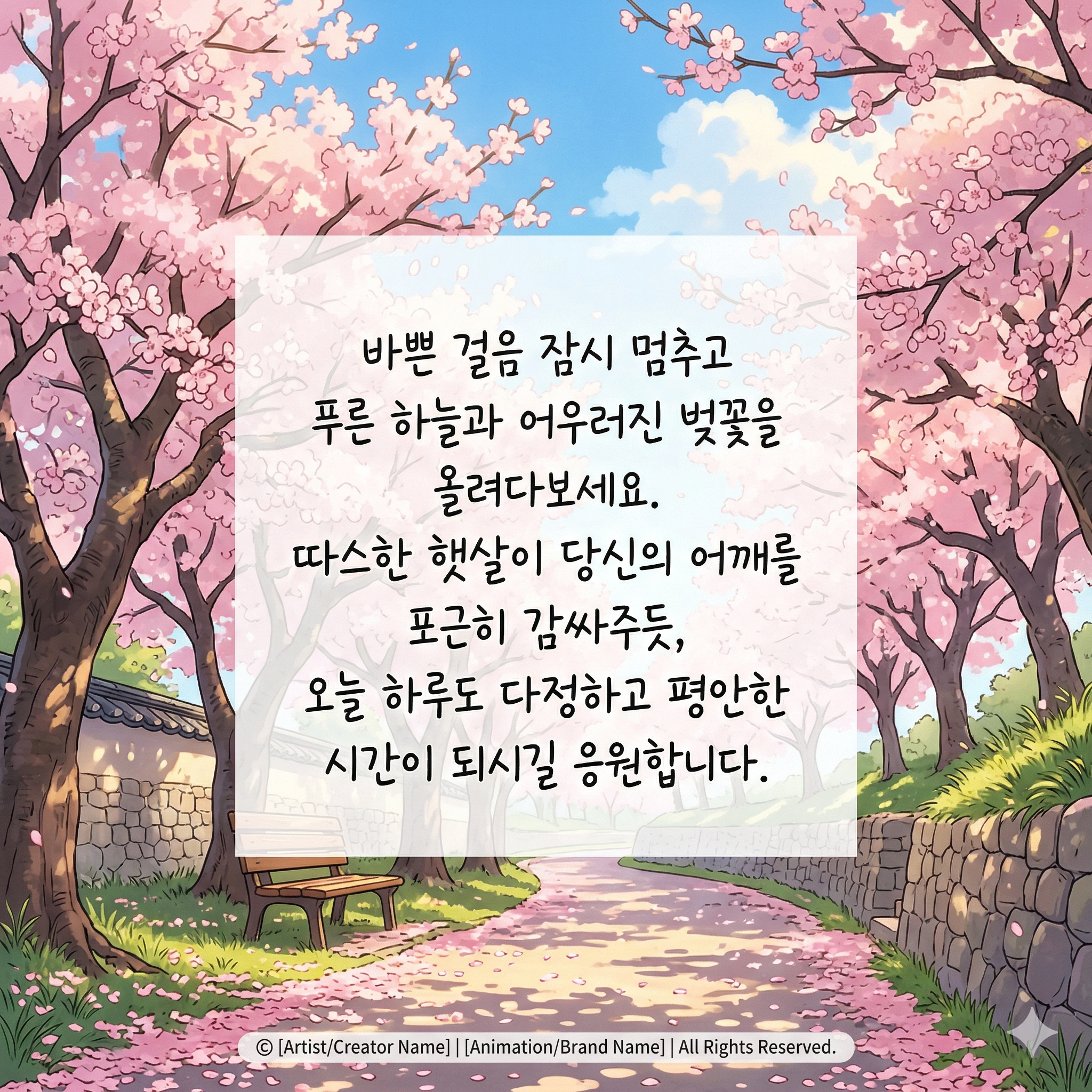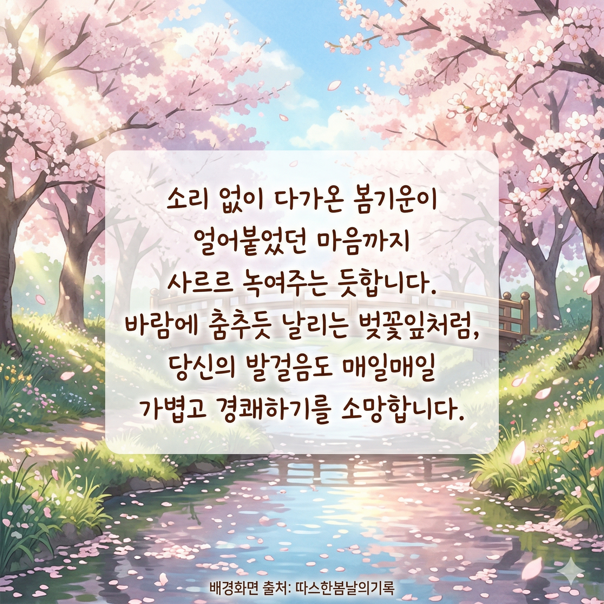 4. 벚꽃이 흐드러지게 피는 아름다운 계절입니다. 환절기 건강 유의하시고, 가정에 늘 평안이 깃드시길 바랍니다.