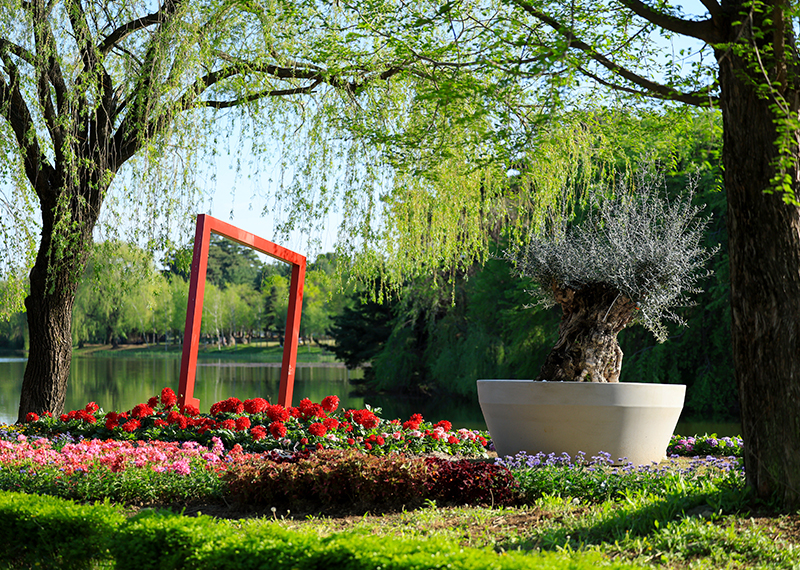 호수공원 중앙에 위치한 10m 높이의 거대 꽃 조형물은 단순한 조각상이 아니라 톱니바퀴가 정교하게 맞물려 움직이는 거대한 꽃시계입니다. 정각이 되면 웅장한 음악과 함께 꽃잎이 흩날리는 퍼포먼스가 펼쳐집니다.