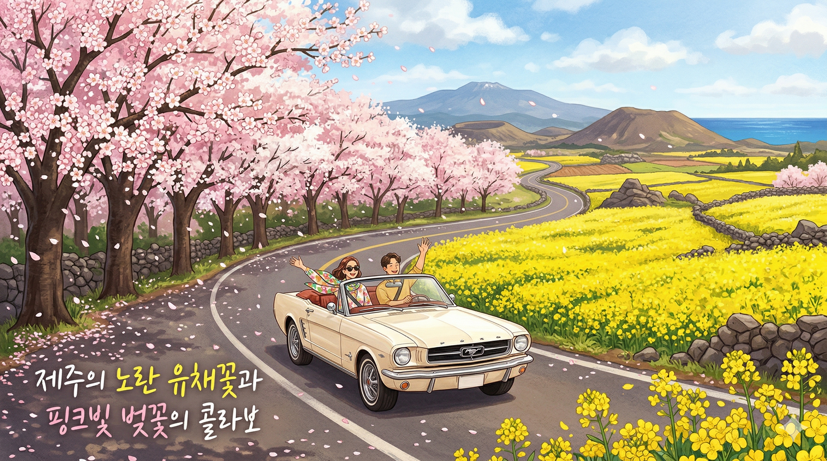 가시리 녹산로는 유채꽃과 연분홍 벚꽃이 어우러져 동화 속 한 장면 같습니다. 인생 사진을 남기기에 완벽하지만, 시즌 항공권과 렌터카 비용이 치솟아 지갑 사정에 꽤 타격이 크다는 점을 염두에 두세요.