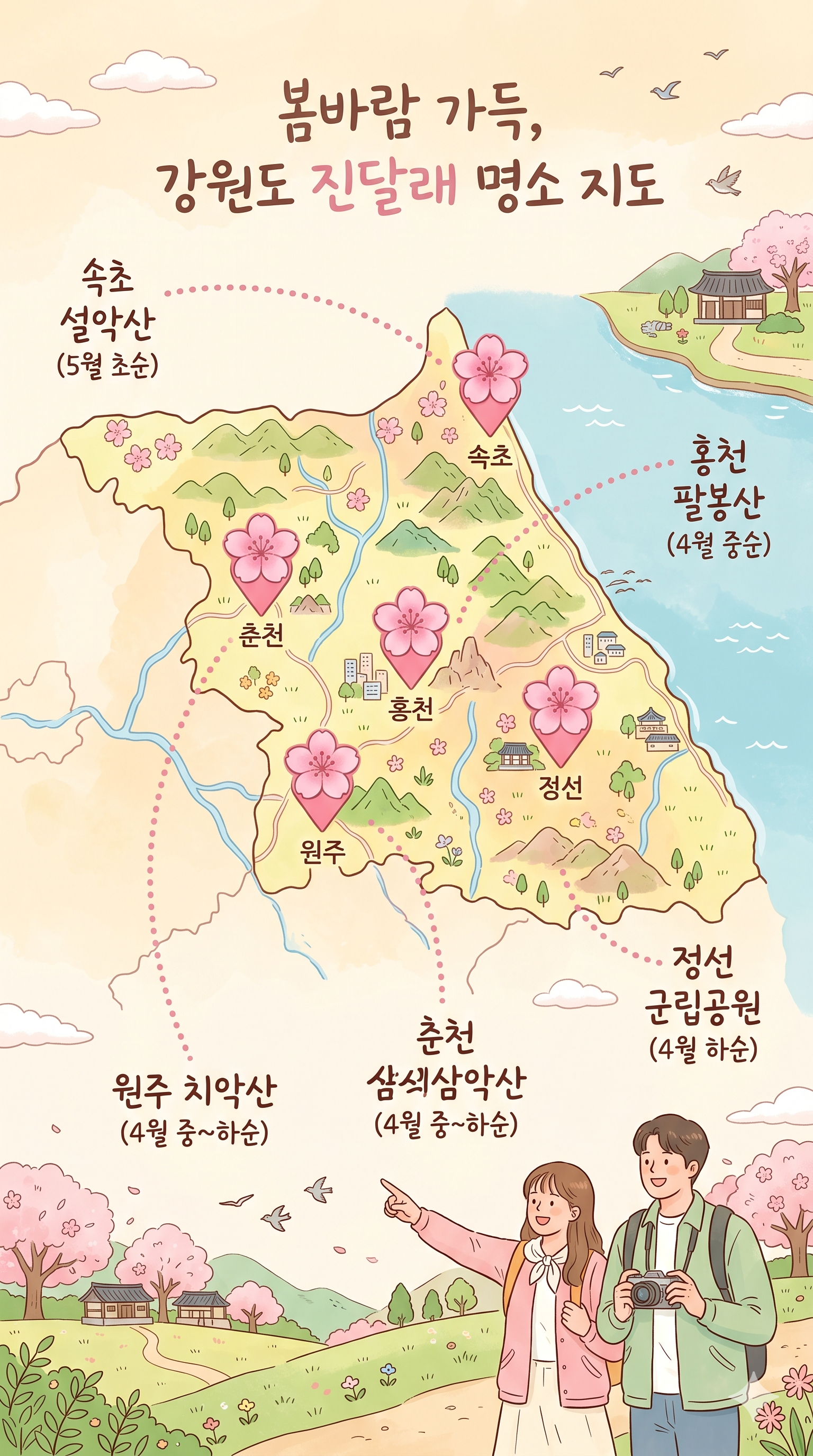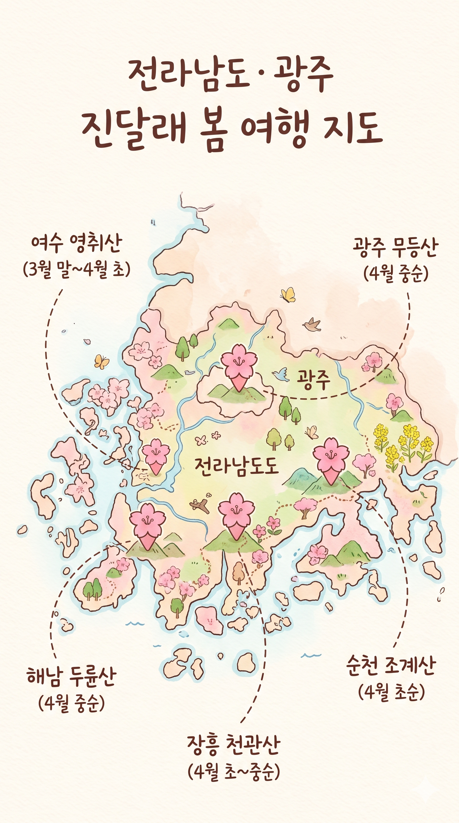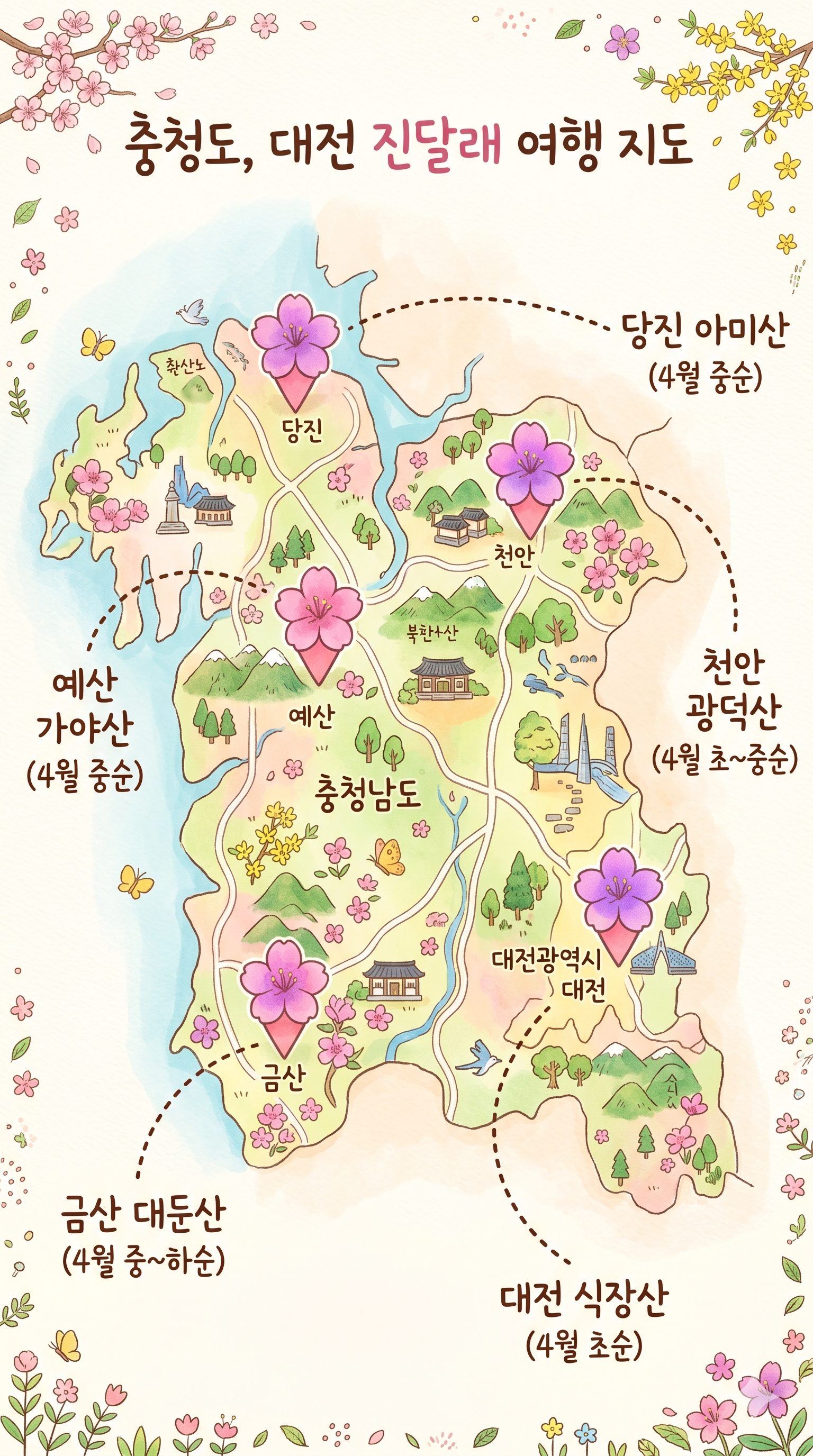올봄, 어디로 떠날지 고민이신 분들을 위해 전국 방방곡곡에 숨겨진 진달래 명소들을 지역별로 5개씩 꽉 채워 정리해 보았습니다. 워낙 아름다운 곳이 많아 고르기 쉽지 않았지만, 개화 시기부터 지역별 날씨, 추천 옷차림, 그리고 대표 음식까지 한눈에 보기 좋게 정리해 드릴게요! 이 글은 꼭 저장해두시고 다가오는 봄나들이 계획에 활용해 보세요.