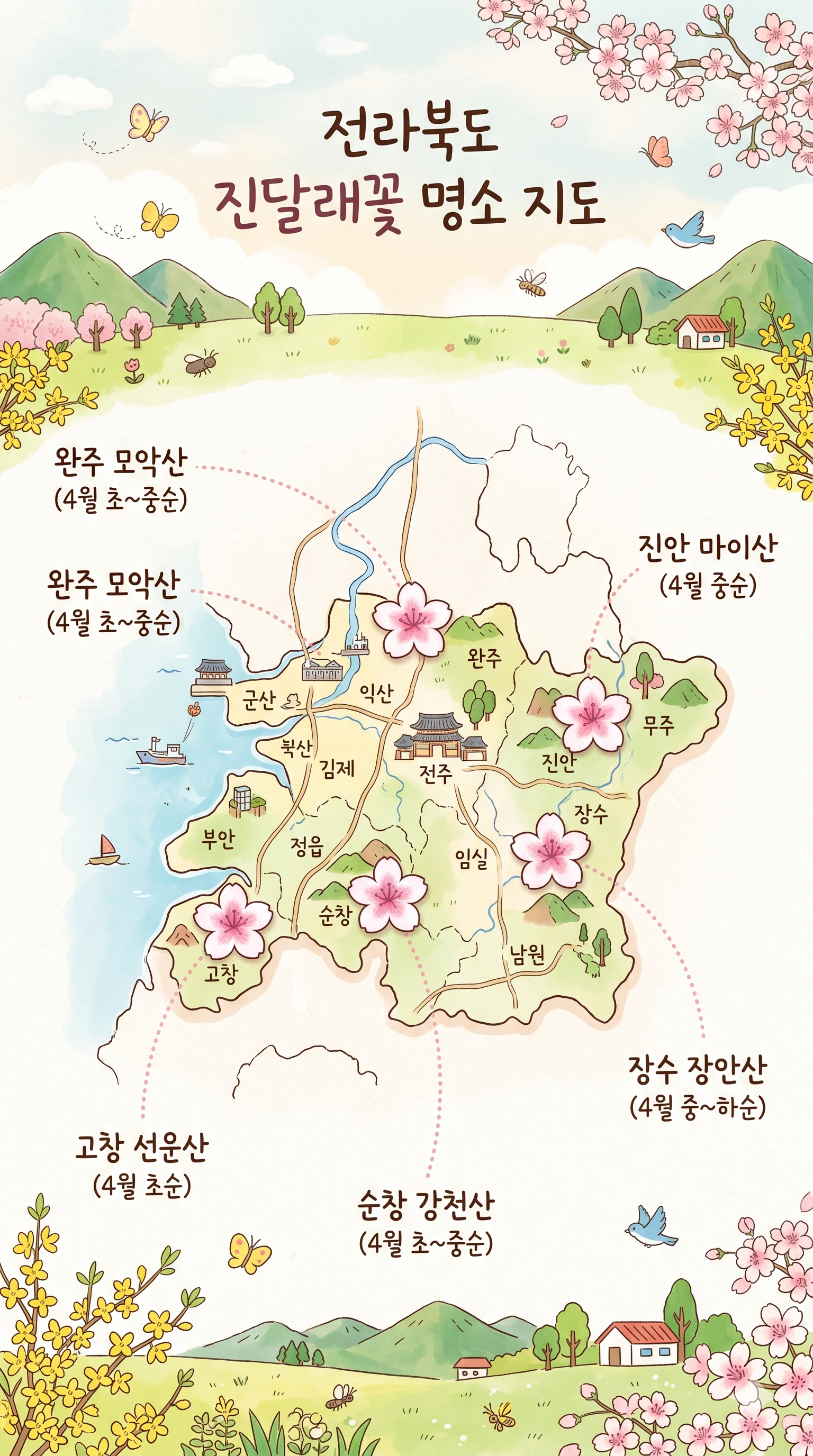 | 진안 마이산 진달래 | 4월 중순 | 전북 진안군 마이산로 | 두 개의 거대한 바위산 아래 옹기종기 피어나는 짙은 분홍빛 |